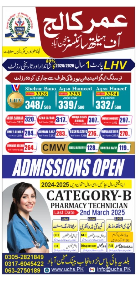 Welcome to Umar College of Health Sciences, a distinguished institution dedicated to shaping the future of healthcare professionals. Affiliated with prestigious organizations such as the Pakistan Pharmacy Council, Punjab Medical Faculty, and Punjab Nursing Council, we are committed to excellence in medical education and training.At Umar College of Health Sciences, our mission is to cultivate a learning environment where aspiring healthcare professionals can thrive. We aim to provide quality education, practical training, and hands-on experience to empower our students with the skills and knowledge needed to excel in their chosen fields.We offer a diverse range of medical short courses designed to meet the evolving needs of the healthcare industry. Our programs include:Bachelor of Pharmacy (B. Pharmacy)Dispenser CourseOperation Theater Technician (OTT)Medical Laboratory Technician (MLT)Radiology Imaging Technician (RIT)And many more...Our affiliation with esteemed organizations ensures that our curriculum meets the highest standards of education and training. By aligning with the Pakistan Pharmacy Council, Punjab Medical Faculty, and Punjab Nursing Council, we guarantee that our graduates are equipped with the necessary qualifications to embark on successful careers in healthcare....