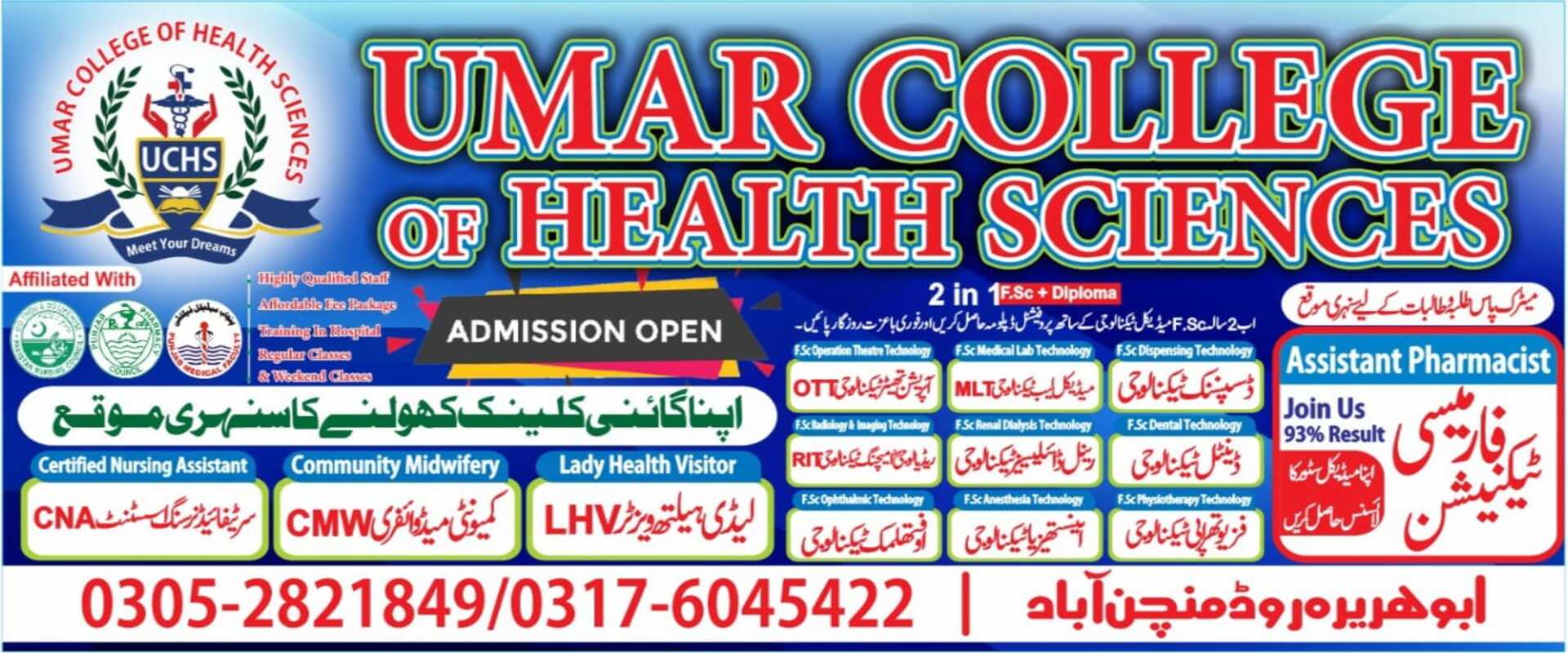 Welcome to Umar College of Health Sciences, a distinguished institution dedicated to shaping the future of healthcare professionals. Affiliated with prestigious organizations such as the Pakistan Pharmacy Council, Punjab Medical Faculty, and Punjab Nursing Council, we are committed to excellence in medical education and training.At Umar College of Health Sciences, our mission is to cultivate a learning environment where aspiring healthcare professionals can thrive. We aim to provide quality education, practical training, and hands-on experience to empower our students with the skills and knowledge needed to excel in their chosen fields.We offer a diverse range of medical short courses designed to meet the evolving needs of the healthcare industry. Our programs include:Bachelor of Pharmacy (B. Pharmacy)Dispenser CourseOperation Theater Technician (OTT)Medical Laboratory Technician (MLT)Radiology Imaging Technician (RIT)And many more...Our affiliation with esteemed organizations ensures that our curriculum meets the highest standards of education and training. By aligning with the Pakistan Pharmacy Council, Punjab Medical Faculty, and Punjab Nursing Council, we guarantee that our graduates are equipped with the necessary qualifications to embark on successful careers in healthcare....